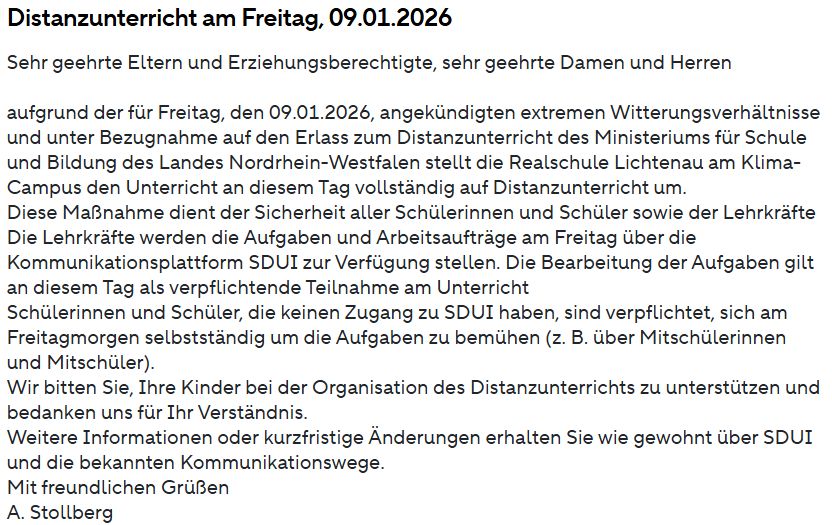 WICHTIG: Am Freitag, 09.01.2026, findet aufgrund der extremen Witterungsverhältnisse Distanzunterricht von Zuhause statt. Die Schüler*innen bearbeiten ihre über Sdui gestellten Aufgaben zuhause und/oder nehmen an Videokonferenzen mit den Lehrkräften teil.