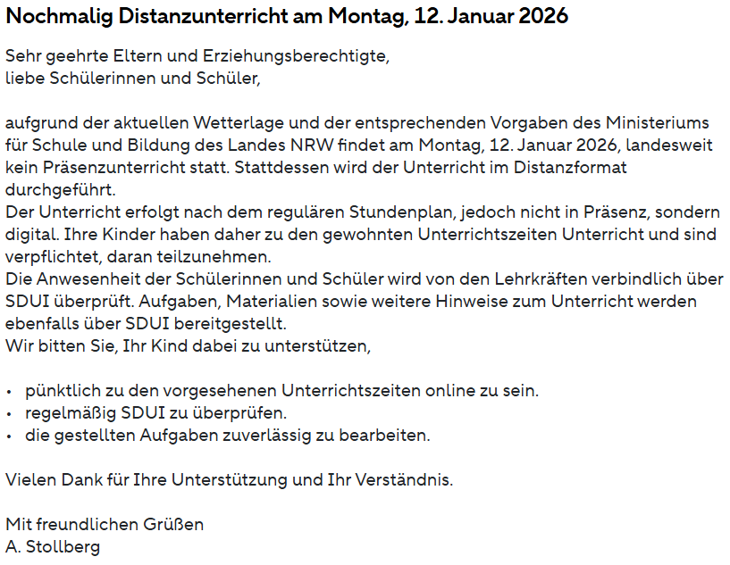 WICHTIG: Am Montag, 12.01.2026, findet aufgrund der extremen Witterungsverhältnisse erneut Distanzunterricht von Zuhause statt. Die Schüler*innen bearbeiten ihre über Sdui gestellten Aufgaben zuhause und/oder nehmen an Videokonferenzen mit den Lehrkräften teil. Es gilt der reguläre Stundenplan inkl. Zeiten.