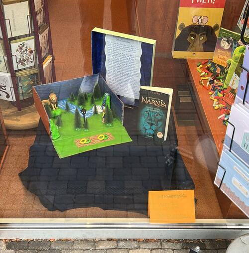 Das Ergebnis der Schülerin Amelie Thiel (7a) begeisterte ihre Großmutter als Buchhändlerin gleich so stark, dass sie die Lesekiste zum Buch „Die Chroniken von Narnia“ gleich in der Buchhandlung Podzum in Marsberg ausstellte.